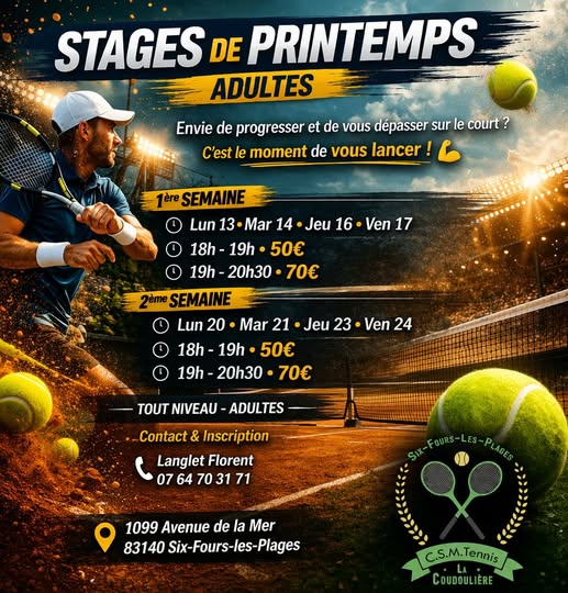 Envie d'améliorer votre revers ou simplement de vous défouler sur le court ? Rejoignez-nous pour nos stages au C.S.M. Tennis La Coudoulière ! ![]()